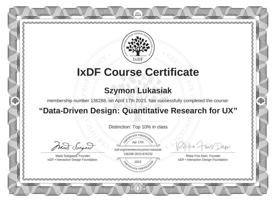 Szymon Łukasiak's IxDF Course Certificate: Data-Driven Design: Quantitative Research for UX