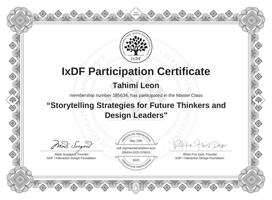 Tahimi Leon's IxDF Masterclass Certificate: Storytelling Strategies for Future Thinkers and Design Leaders