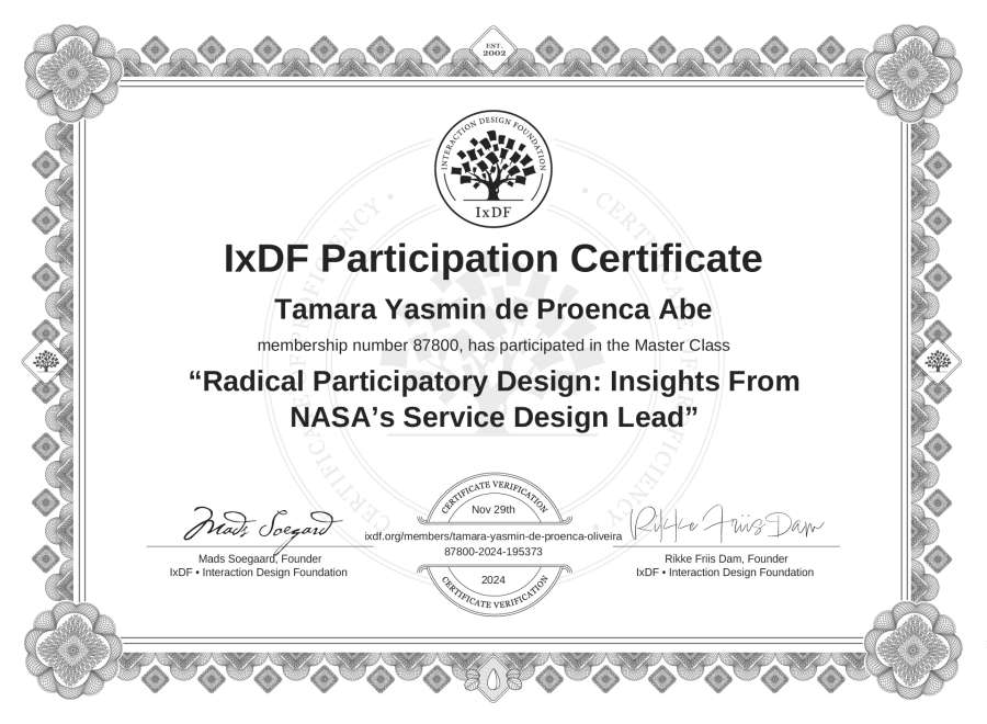 Tamara Yasmin de Proença Abe's IxDF Masterclass Certificate: Radical Participatory Design: Insights From NASA’s Service Design Lead