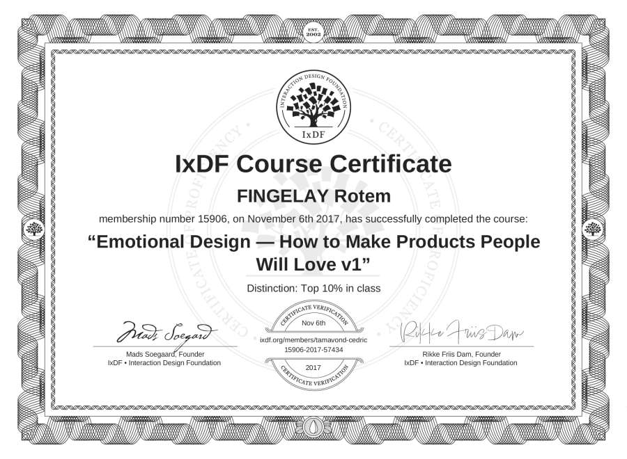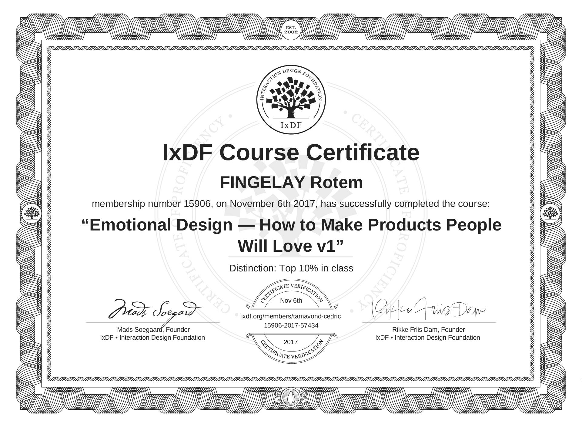 FINGELAY Rotem's IxDF Course Certificate: Emotional Design — How to Make Products People Will Love v1