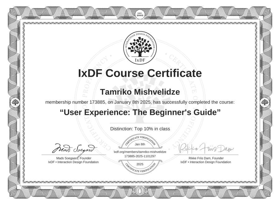 The IxDF Course Certificate above is awarded to Tamriko Mishvelidze with a Top 10% Distinction in formal recognition of their coursework surpassing the rigorous benchmarks of exceptional performance established by the IxDF Educational Codex.