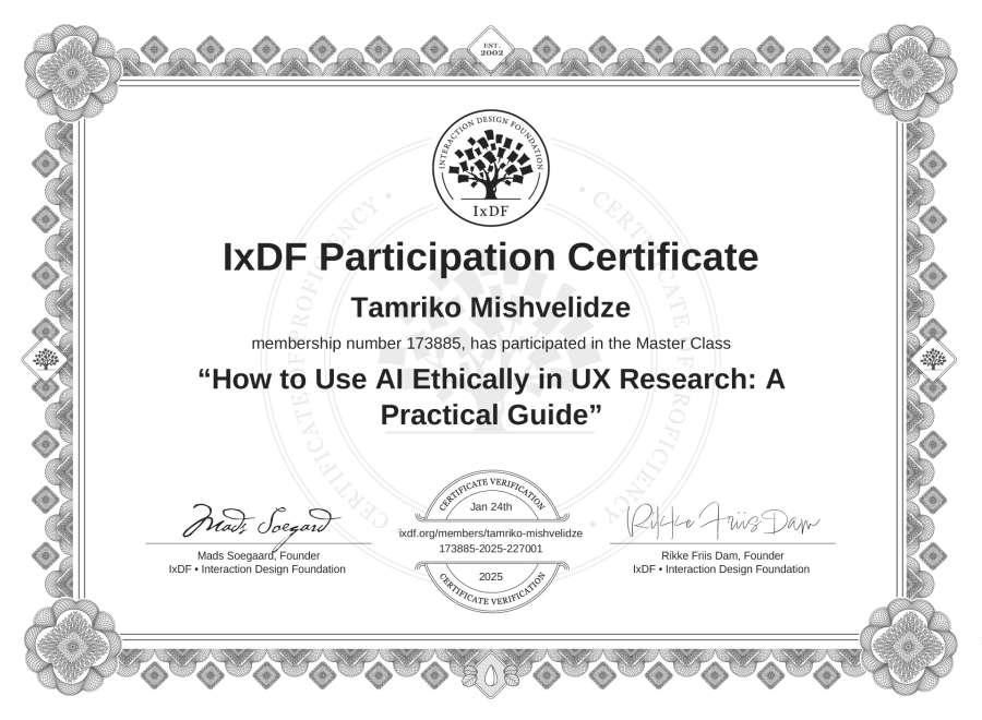 Tamriko Mishvelidze's IxDF Masterclass Certificate: How to Use AI Ethically in UX Research: A Practical Guide