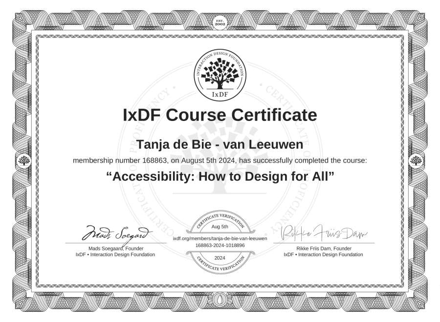 Tanja de Bie - van Leeuwen's IxDF Course Certificate: Accessibility: How to Design for All
