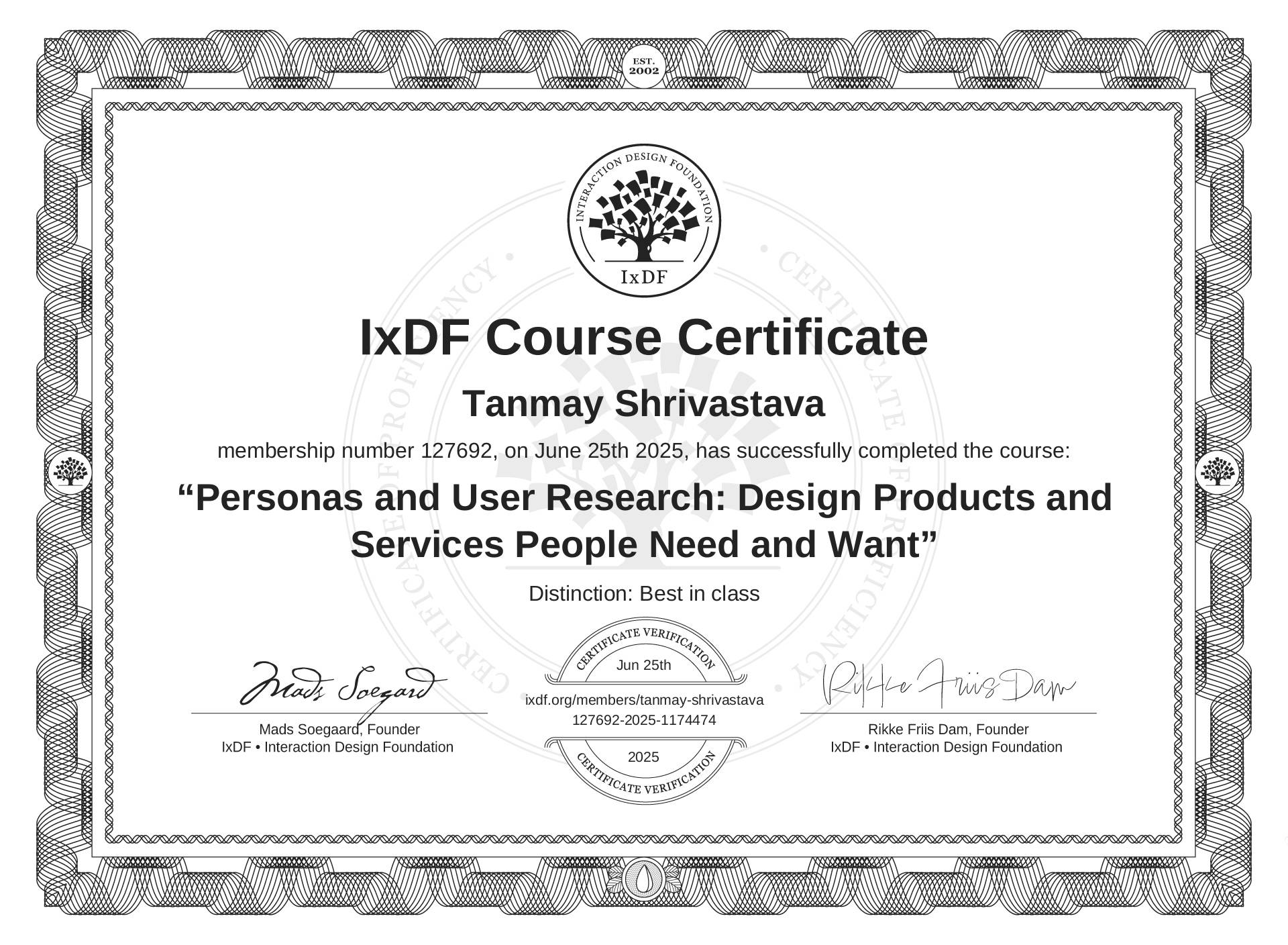 The IxDF Course Certificate above is awarded to Tanmay Shrivastava with a Best in Class Distinction in formal recognition of their coursework surpassing the rigorous benchmarks of exceptional performance established by the IxDF Educational Codex.