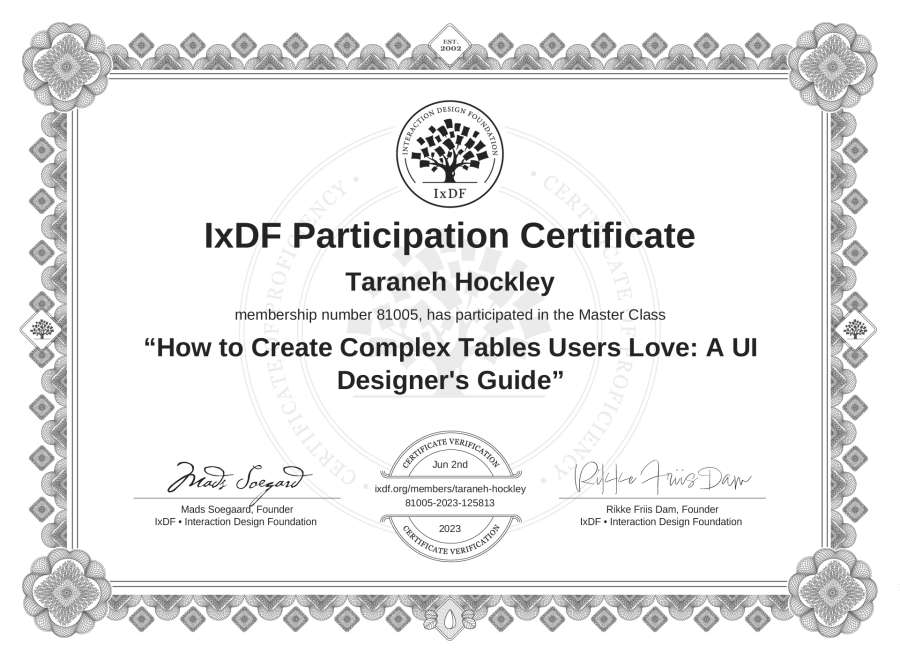 Taraneh Hockley's IxDF Masterclass Certificate: How to Create Complex Tables Users Love: A UI Designer's Guide