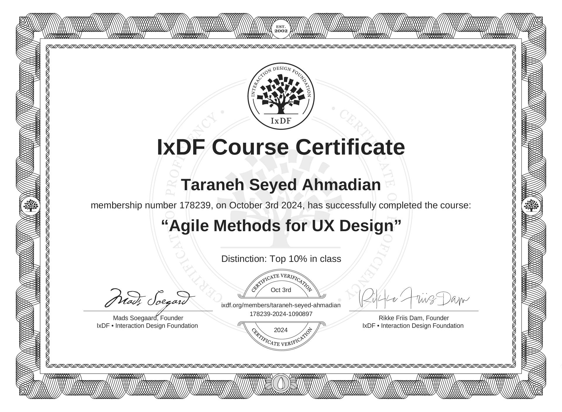 The IxDF Course Certificate above is awarded to Taraneh Seyed Ahmadian with a Top 10% Distinction in formal recognition of their coursework surpassing the rigorous benchmarks of exceptional performance established by the IxDF Educational Codex.