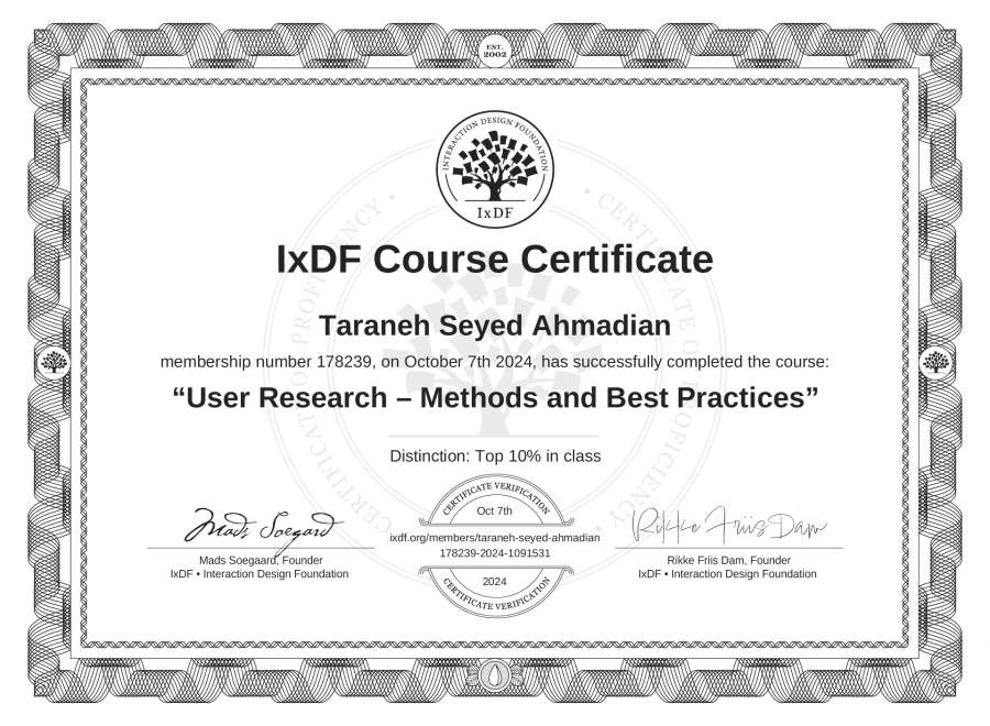 The IxDF Course Certificate above is awarded to Taraneh Seyed Ahmadian with a Top 10% Distinction in formal recognition of their coursework surpassing the rigorous benchmarks of exceptional performance established by the IxDF Educational Codex.