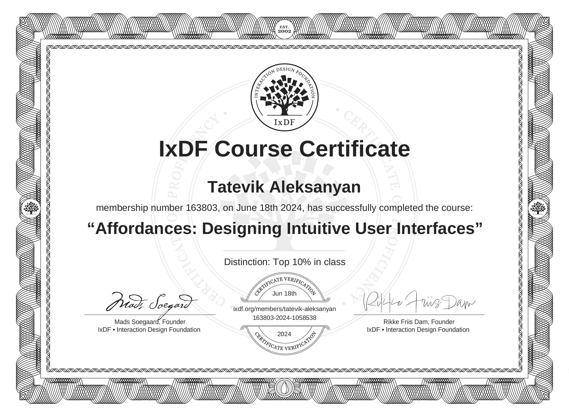 Tatevik Aleksanyan's IxDF Course Certificate: Affordances: Designing Intuitive User Interfaces