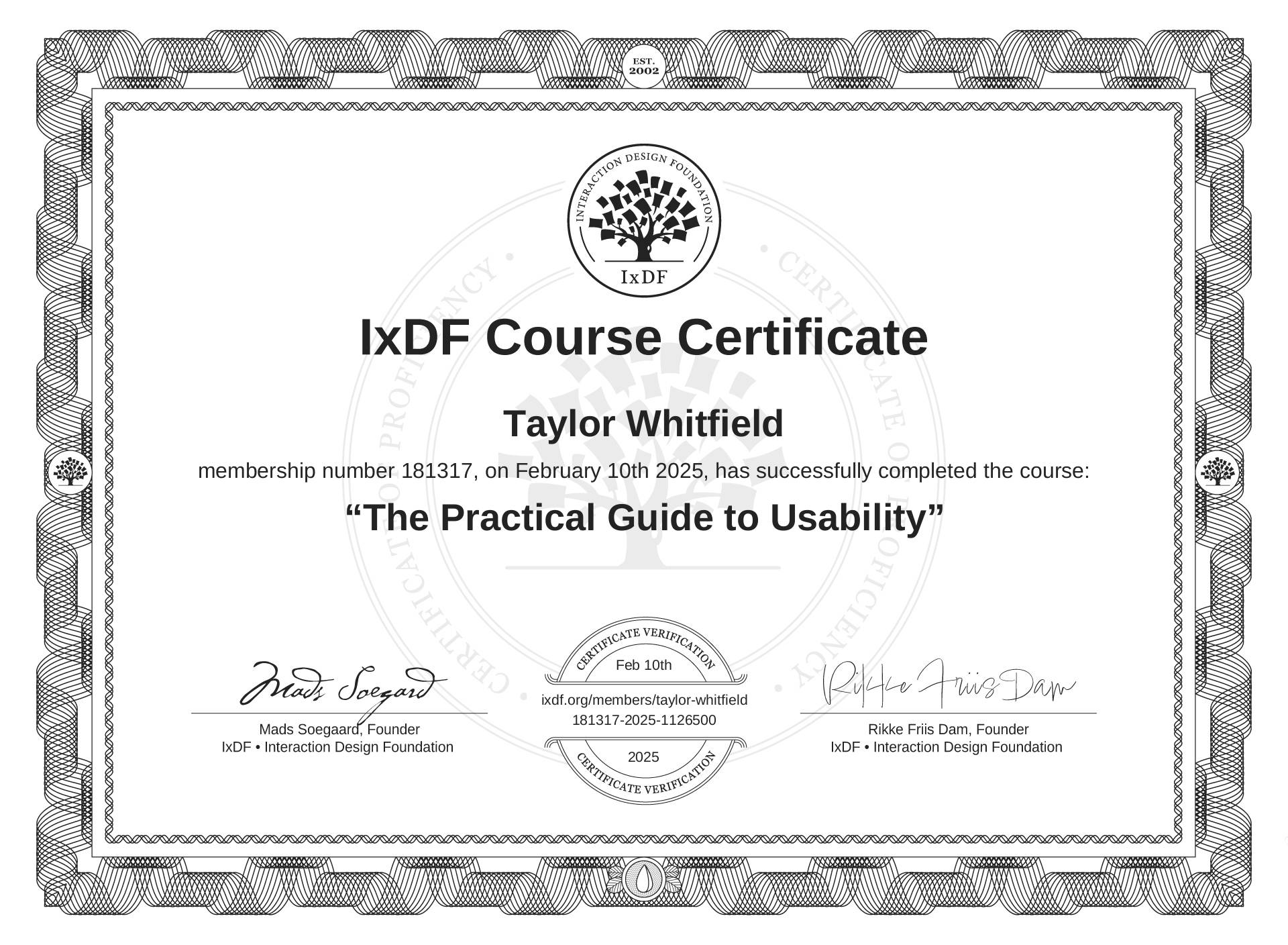 Taylor Whitfield's IxDF Course Certificate: The Practical Guide to Usability