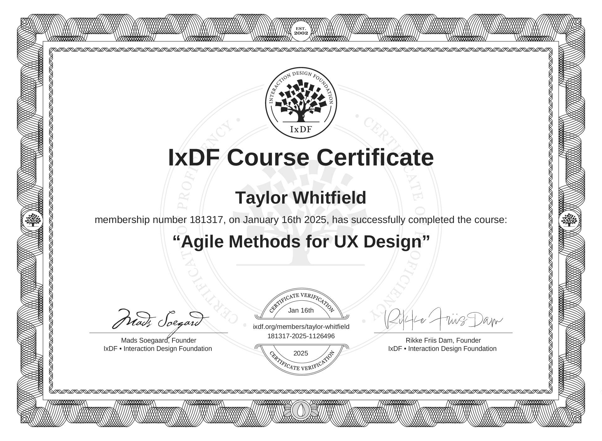 The IxDF Course Certificate above is awarded to Taylor Whitfield in formal recognition of their coursework surpassing the rigorous benchmarks of exceptional performance established by the IxDF Educational Codex.