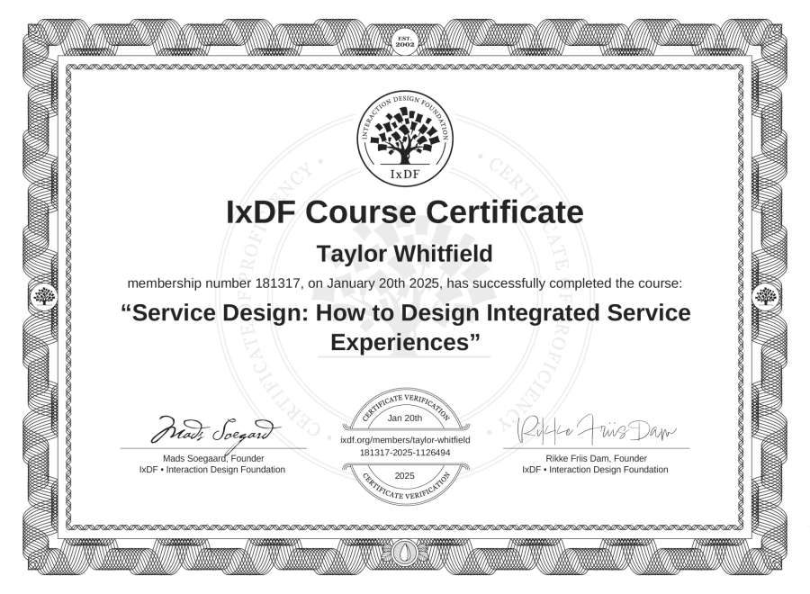 Taylor Whitfield's IxDF Course Certificate: Service Design: How to Design Integrated Service Experiences