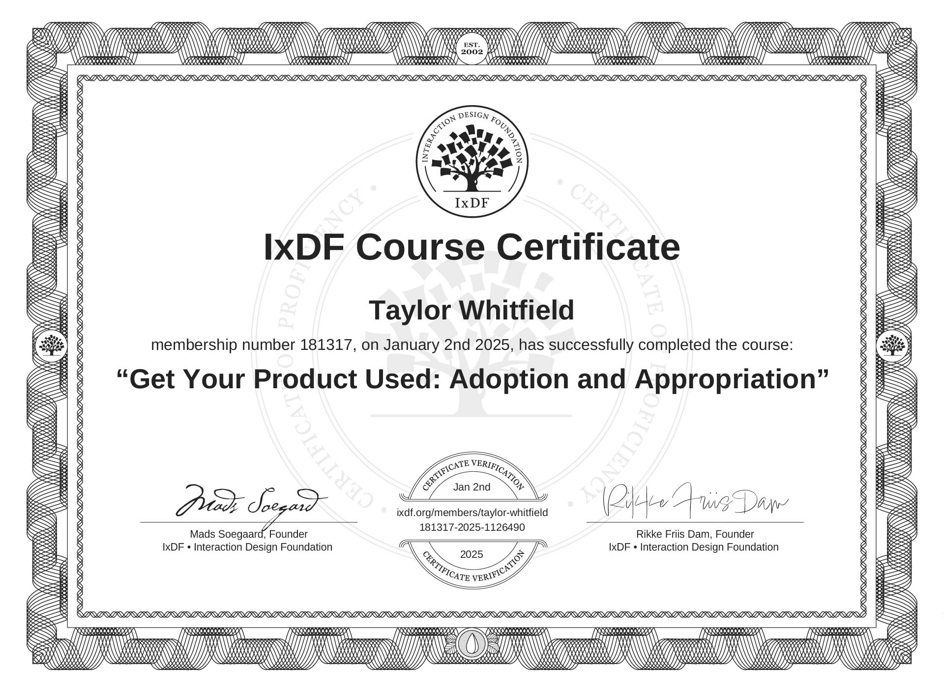 The IxDF Course Certificate above is awarded to Taylor Whitfield in formal recognition of their coursework surpassing the rigorous benchmarks of exceptional performance established by the IxDF Educational Codex.
