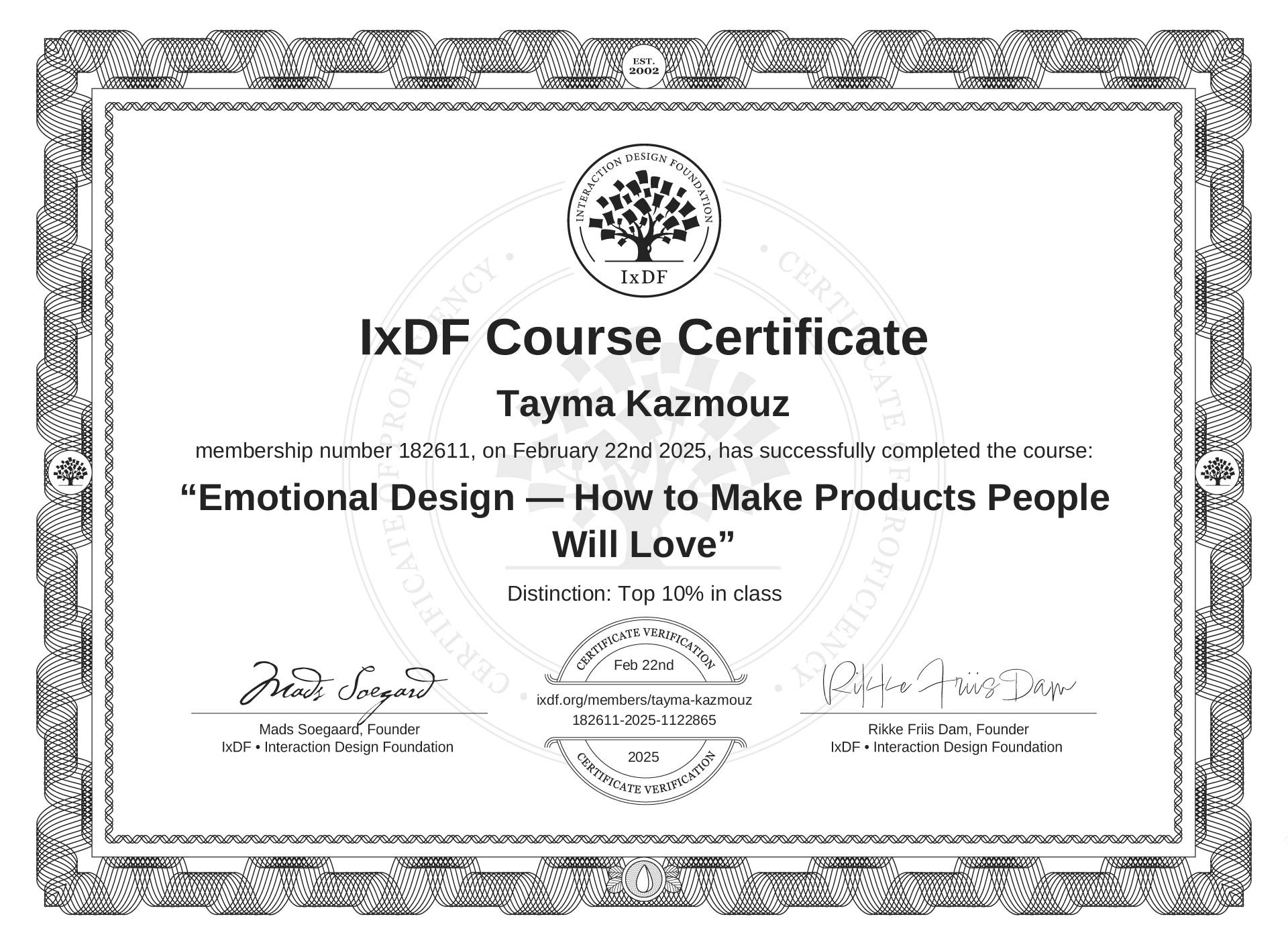 The IxDF Course Certificate above is awarded to Tayma Kazmouz with a Top 10% Distinction in formal recognition of their coursework surpassing the rigorous benchmarks of exceptional performance established by the IxDF Educational Codex.