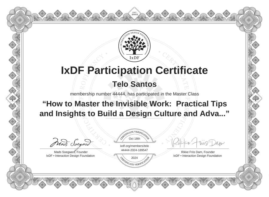Telo Santos's IxDF Masterclass Certificate: How to Master the Invisible Work: Practical Tips and Insights to Build a Design Culture and Advance Your Career