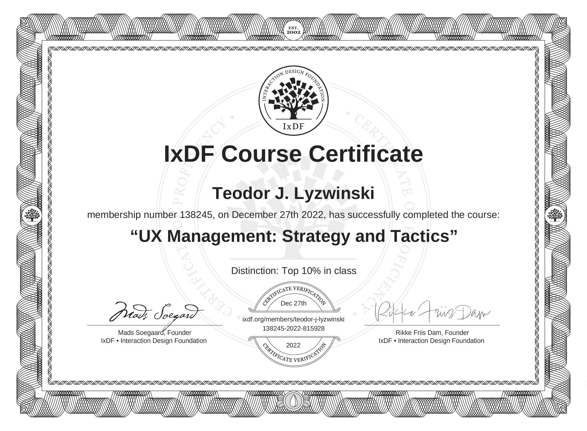 The IxDF Course Certificate above is awarded to Teodor J. Lyzwinski with a Top 10% Distinction in formal recognition of their coursework surpassing the rigorous benchmarks of exceptional performance established by the IxDF Educational Codex.