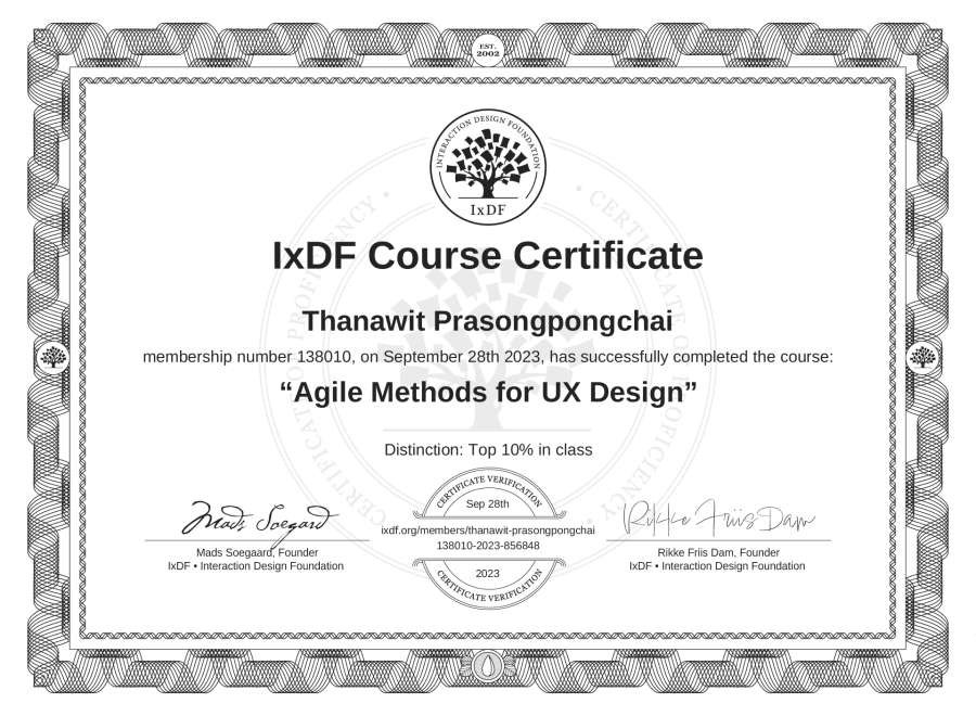 Thanawit Prasongpongchai's IxDF Course Certificate: Agile Methods for UX Design