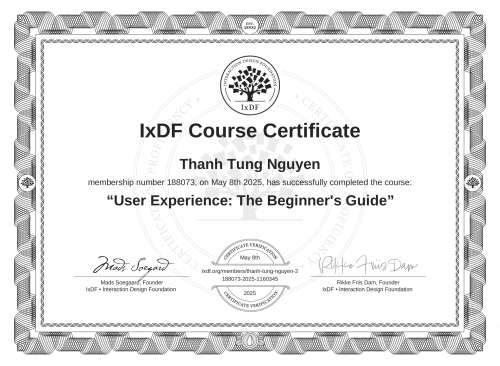 This IxDF Membership Certificate is issued to Thanh Tung Nguyen in formal recognition of their membership of the IxDF, global leader in design education.