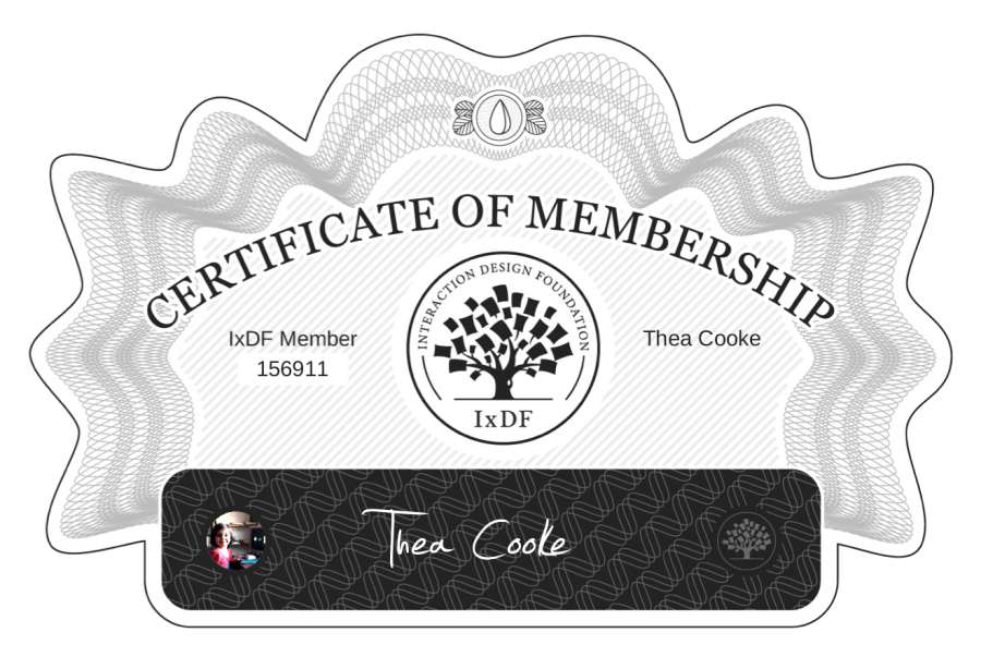 The Membership Certificate below verifies that Thea Cooke is a member of Interaction Design Foundation.