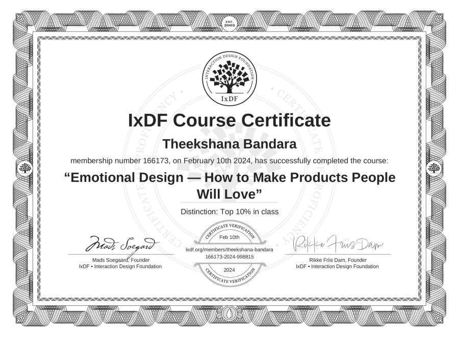 Theekshana Bandara's IxDF Course Certificate: Emotional Design — How to Make Products People Will Love