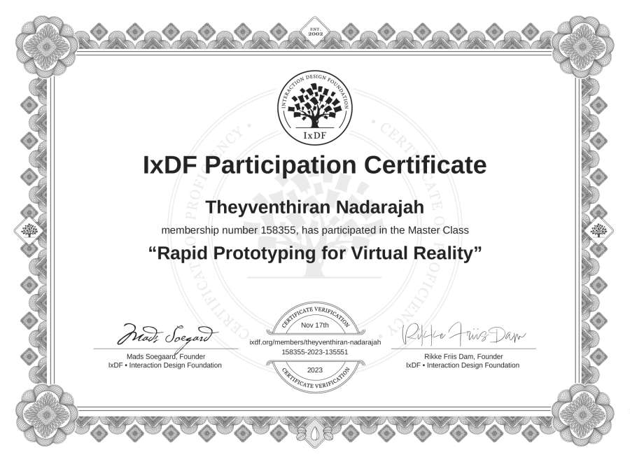 Theyventhiran Nadarajah's IxDF Masterclass Certificate: Rapid Prototyping for Virtual Reality