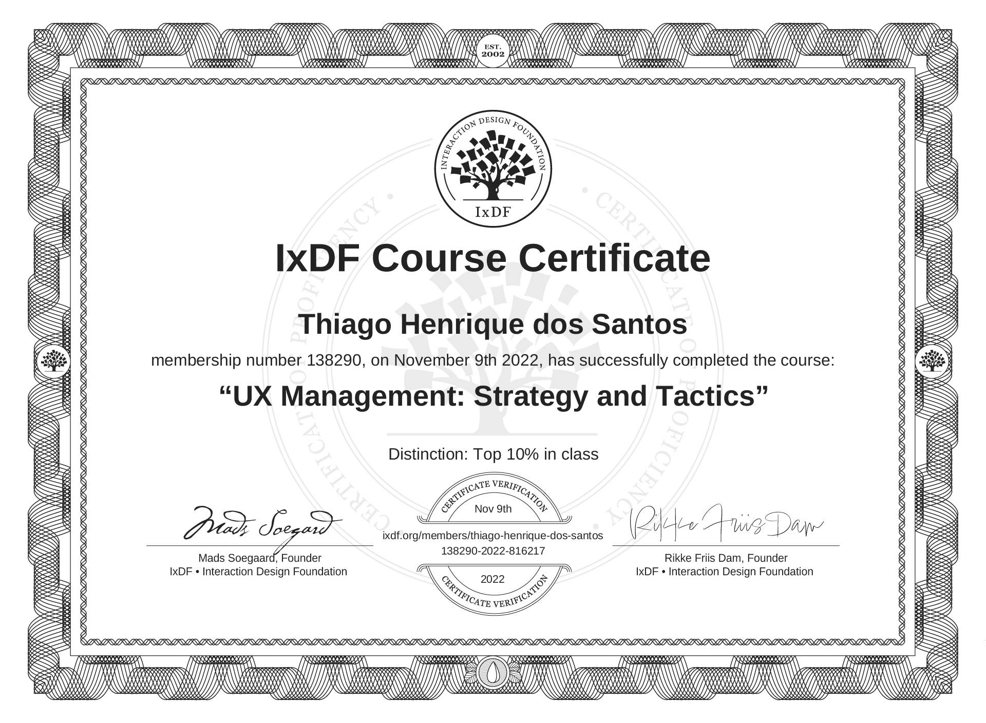 The IxDF Course Certificate above is awarded to Thiago Henrique dos Santos with a Top 10% Distinction in formal recognition of their coursework surpassing the rigorous benchmarks of exceptional performance established by the IxDF Educational Codex.