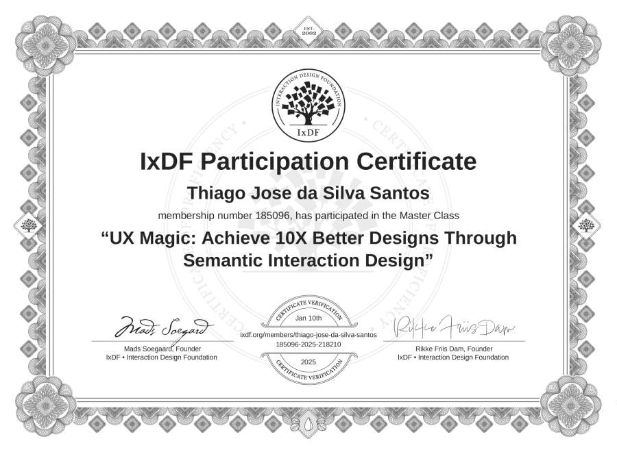 Thiago José da Silva Santos's IxDF Masterclass Certificate: UX Magic: Achieve 10X Better Designs Through Semantic Interaction Design