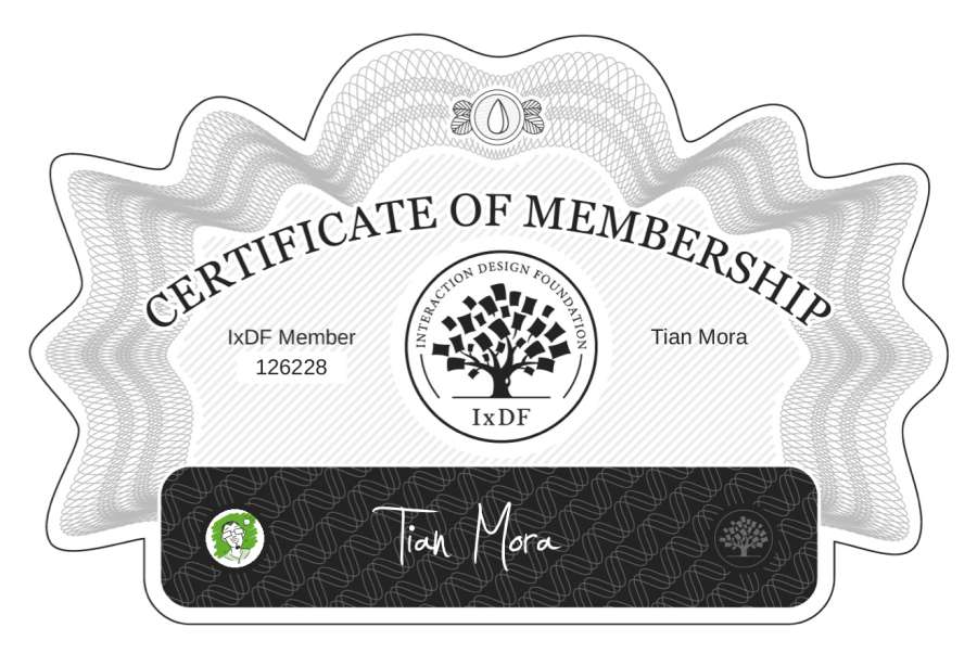 The Membership Certificate below verifies that Tian Mora is a member of Interaction Design Foundation.