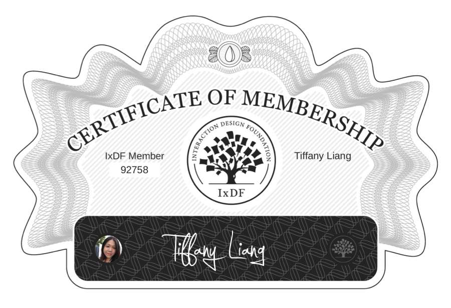 The Membership Certificate below verifies that Tiffany Liang is a member of Interaction Design Foundation.