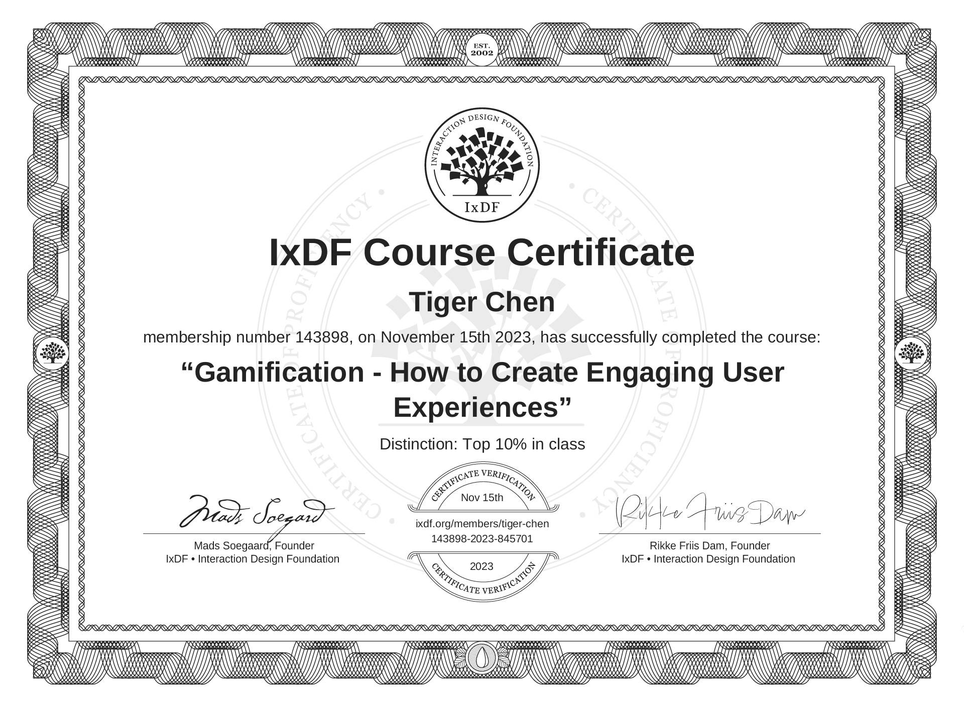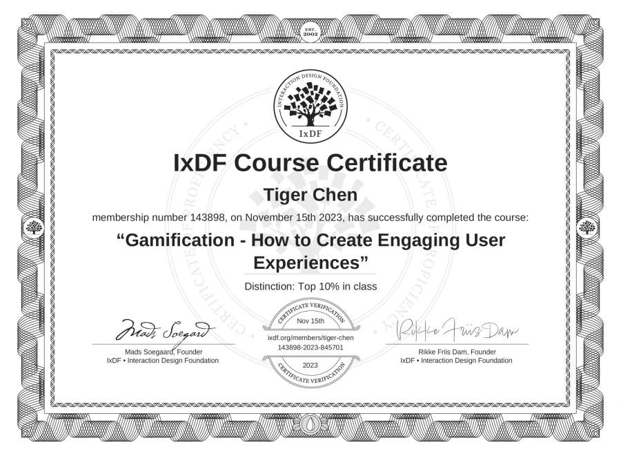 Tiger Chen's IxDF Course Certificate: Gamification - How to Create Engaging User Experiences