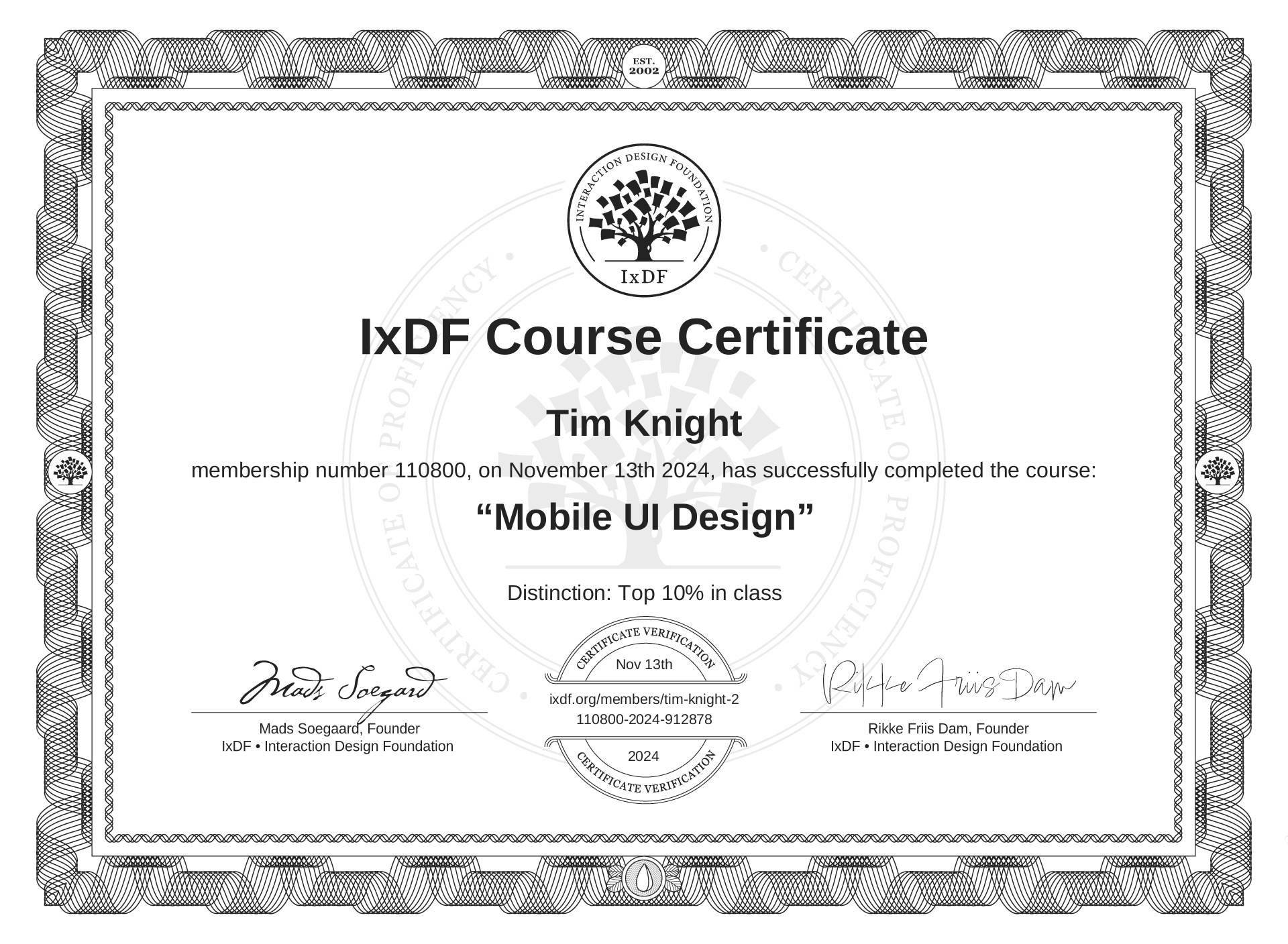 The IxDF Course Certificate above is awarded to Tim Knight with a Top 10% Distinction in formal recognition of their coursework surpassing the rigorous benchmarks of exceptional performance established by the IxDF Educational Codex.