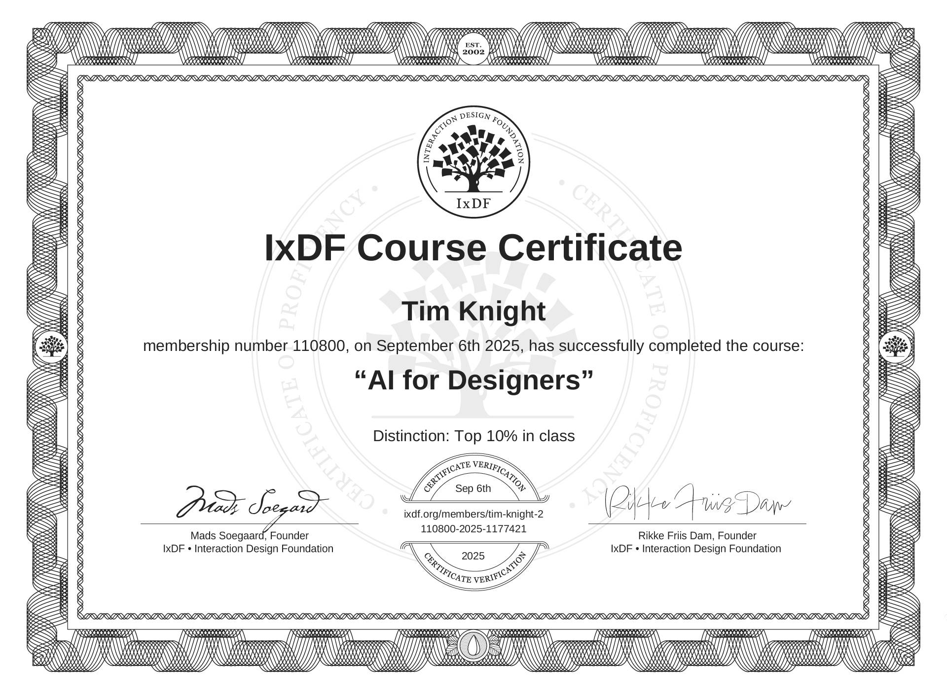 The IxDF Course Certificate above is awarded to Tim Knight with a Top 10% Distinction in formal recognition of their coursework surpassing the rigorous benchmarks of exceptional performance established by the IxDF Educational Codex.