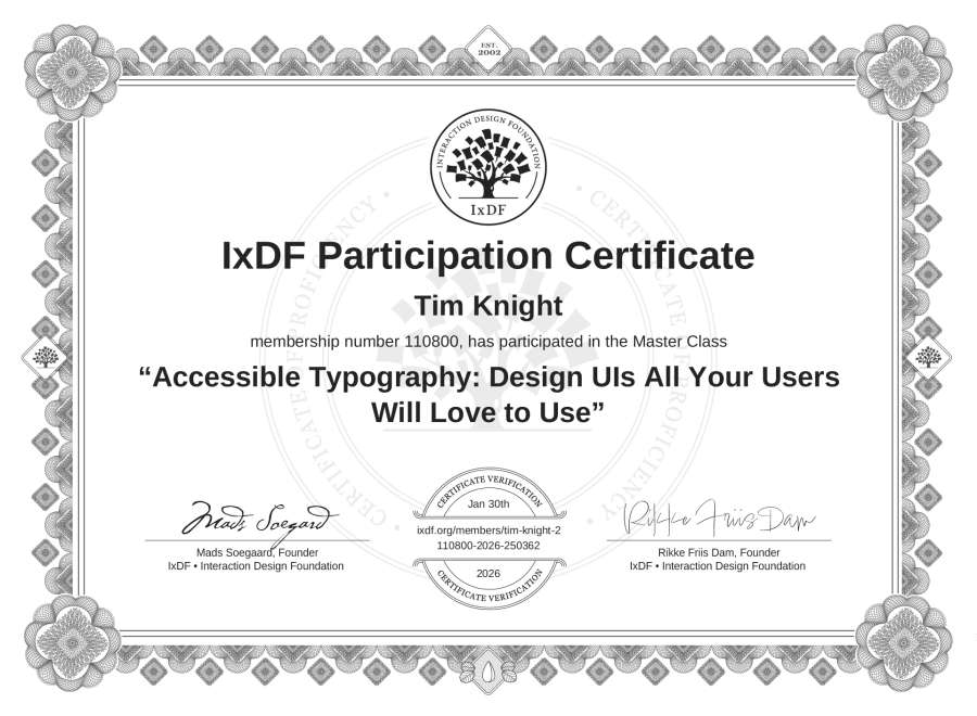 Tim Knight's IxDF Masterclass Certificate: Accessible Typography: Design UIs All Your Users Will Love to Use