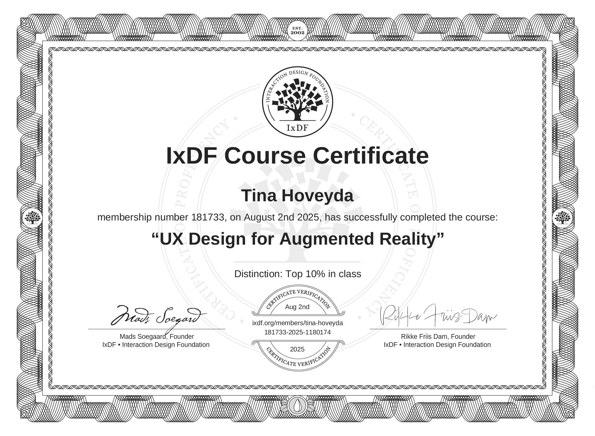 The IxDF Course Certificate above is awarded to Tina Hoveyda with a Top 10% Distinction in formal recognition of their coursework surpassing the rigorous benchmarks of exceptional performance established by the IxDF Educational Codex.