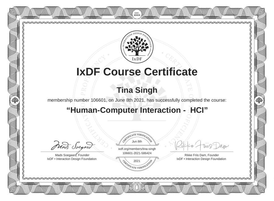 Tina Singh's IxDF Course Certificate: Human-Computer Interaction - HCI