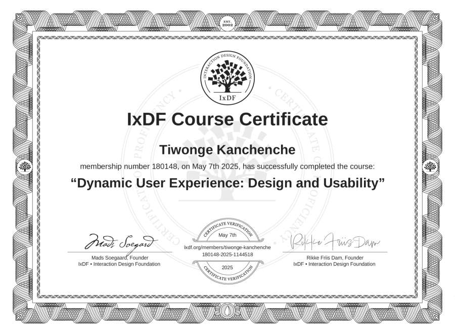 Tiwonge Kanchenche's IxDF Course Certificate: Dynamic User Experience: Design and Usability