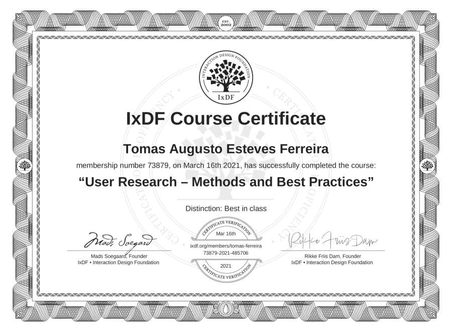The IxDF Course Certificate above is awarded to Tomás Augusto Esteves Ferreira with a Best in Class Distinction in formal recognition of their coursework surpassing the rigorous benchmarks of exceptional performance established by the IxDF Educational Codex.