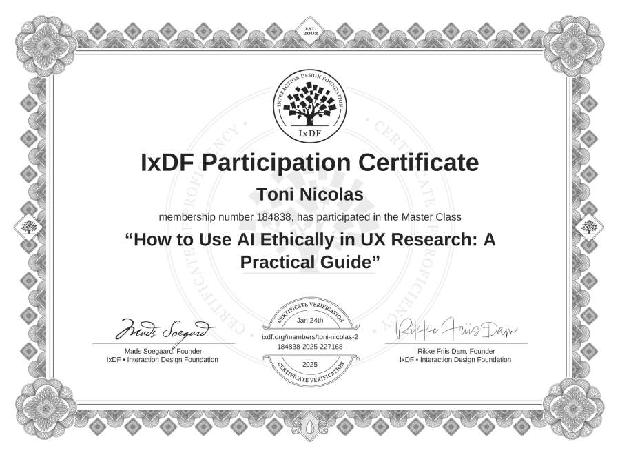 Toni Nicolas's IxDF Masterclass Certificate: How to Use AI Ethically in UX Research: A Practical Guide