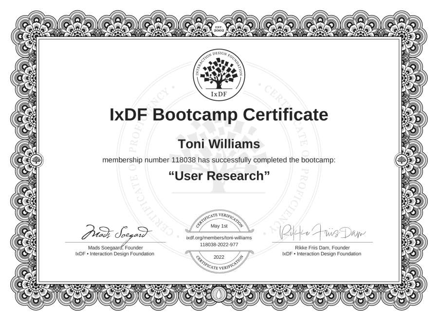 The Bootcamp Certificate below verifies that Toni Williams has completed the bootcamp User Research .
