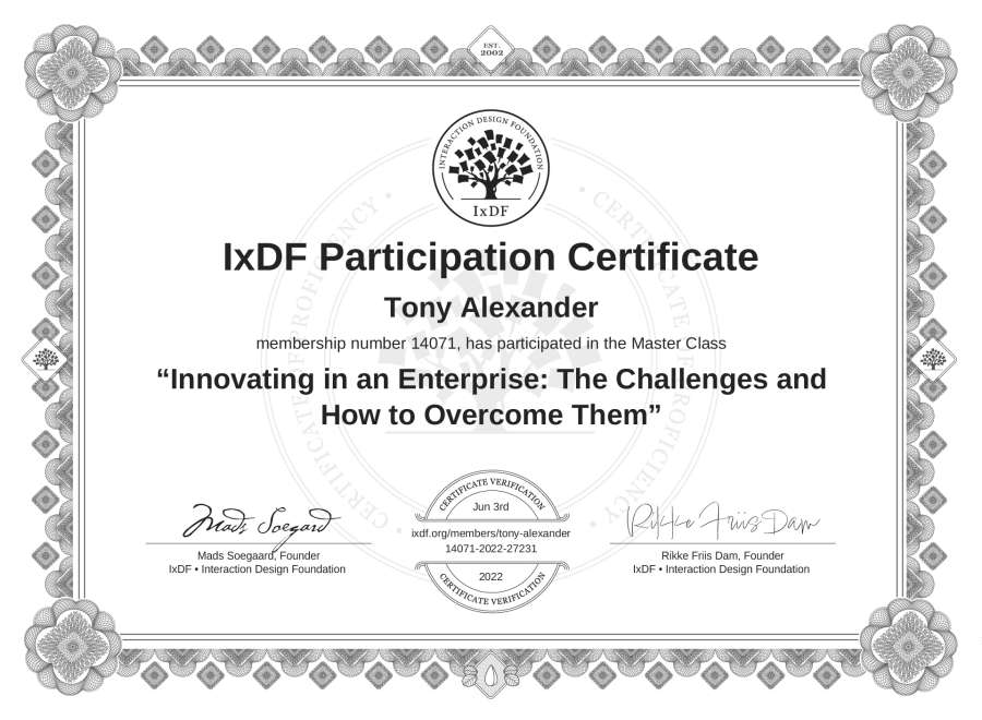Tony Alexander's IxDF Masterclass Certificate: Innovating in an Enterprise: The Challenges and How to Overcome Them