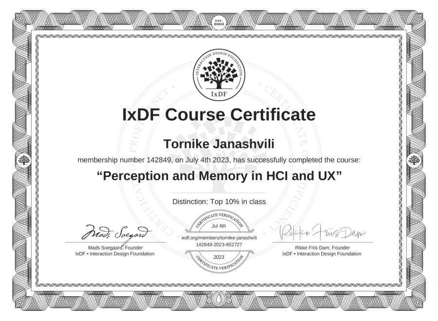 Tornike Janashvili's IxDF Course Certificate: Perception and Memory in HCI and UX
