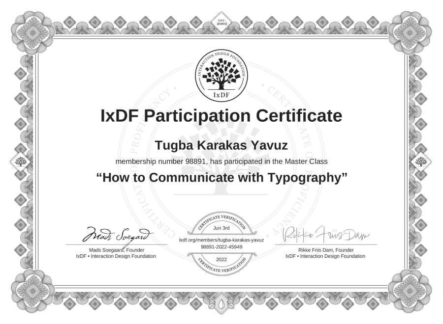Tugba Karakas Yavuz's IxDF Masterclass Certificate: How to Communicate with Typography
