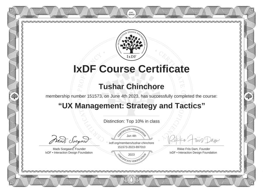 Tushar Chinchore's IxDF Course Certificate: UX Management: Strategy and Tactics
