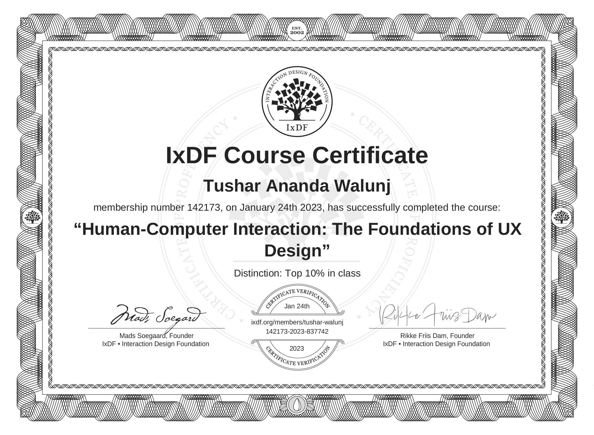Tushar Ananda Walunj's IxDF Course Certificate: Human-Computer Interaction: The Foundations of UX Design