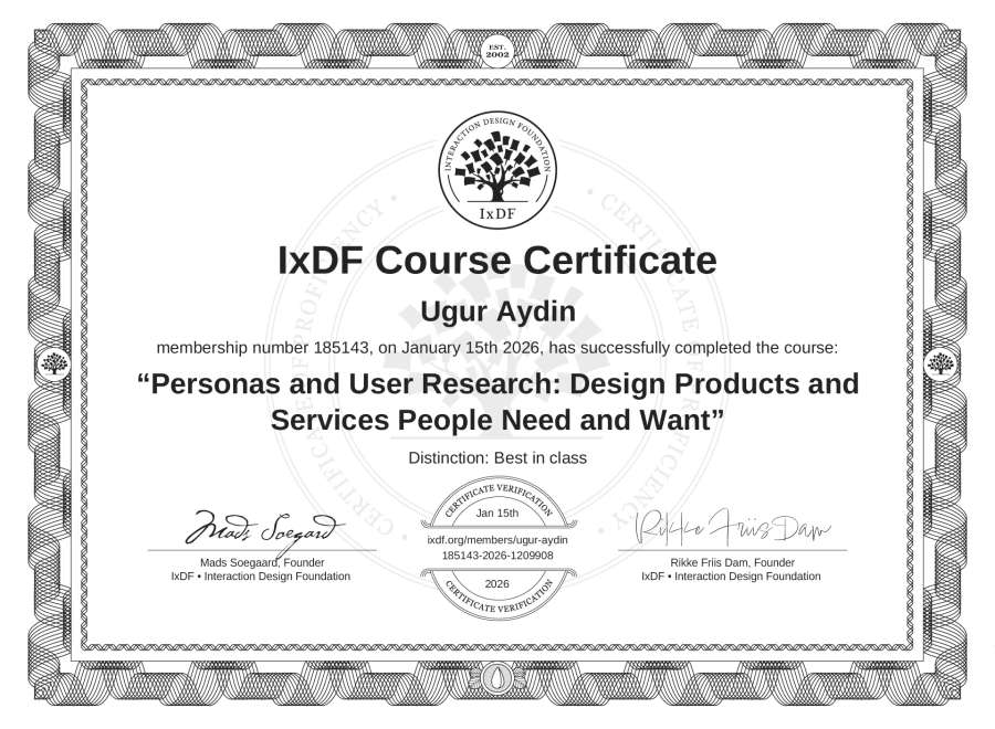 Ugur Aydin's IxDF Course Certificate: Personas and User Research: Design Products and Services People Need and Want