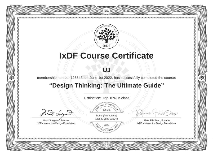 The IxDF Course Certificate above is awarded to UJ with a Top 10% Distinction in formal recognition of their coursework surpassing the rigorous benchmarks of exceptional performance established by the IxDF Educational Codex.