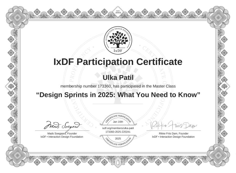 Ulka Patil's IxDF Masterclass Certificate: Design Sprints in 2025: What You Need to Know