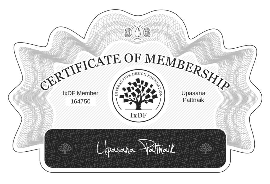 The Membership Certificate below verifies that Upasana Pattnaik is a member of Interaction Design Foundation.