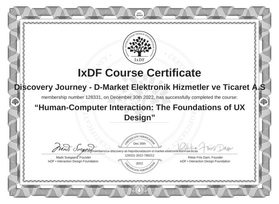The IxDF Course Certificate above is awarded to Discovery Journey - D-Market Elektronik Hizmetler ve Ticaret A.S in formal recognition of their coursework surpassing the rigorous benchmarks of exceptional performance established by the IxDF Educational Codex.