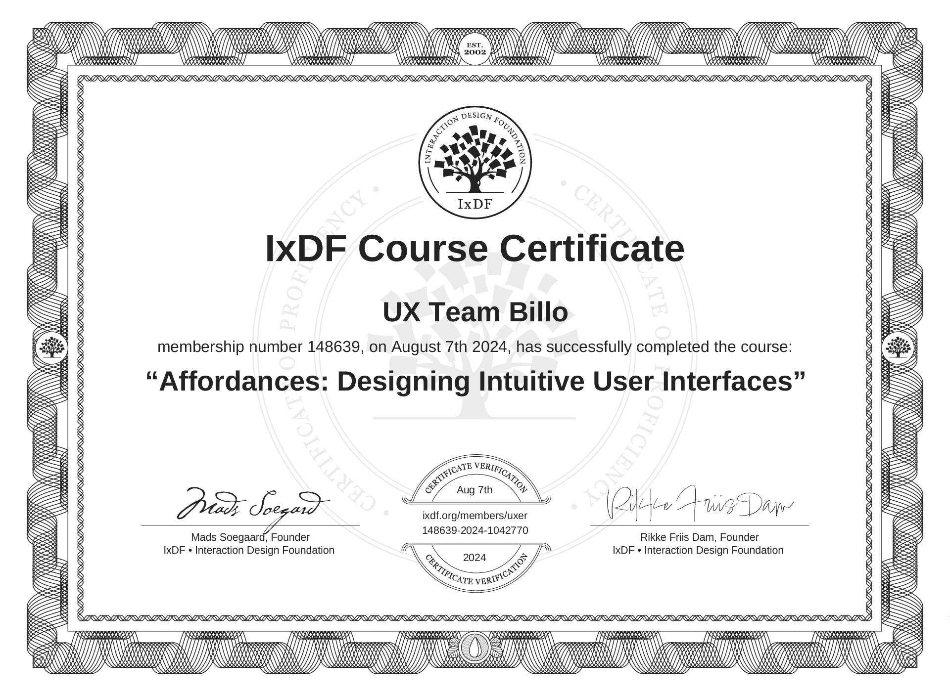 The IxDF Course Certificate above is awarded to UX Team Billo in formal recognition of their coursework surpassing the rigorous benchmarks of exceptional performance established by the IxDF Educational Codex.