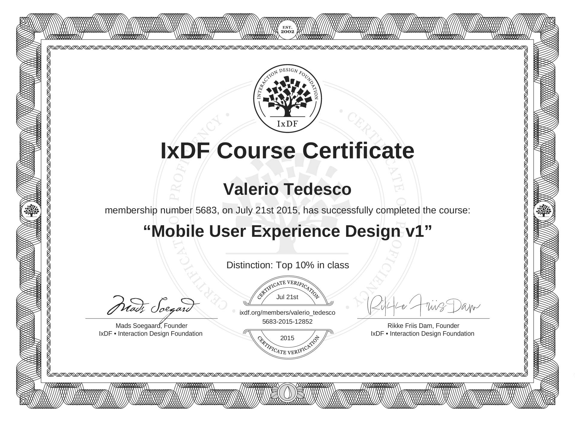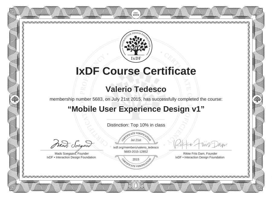 Valerio Tedesco's IxDF Course Certificate: Mobile User Experience Design v1